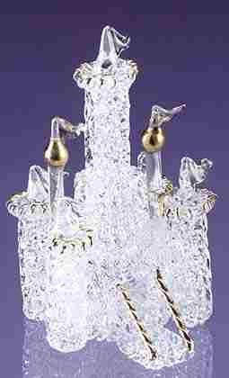 In delicate spun glass, this castle with gold-trimmed details brings back thoughts of King Arthur and days of yore. 2 1/2" x 2 1/8" x 4 1/2" high.