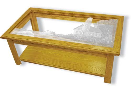 Oak Glass Top Coffee Table With Lighthouse Etched Glass - Lighthouse Coffee Table Furniture - Unique Lighthouse Gift Ideas - Fully Assembled - 39" x 22" x 15" high Feature