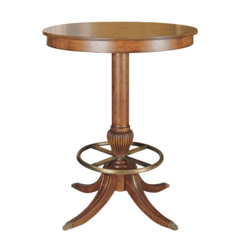 Made of solid birch, and cherry veneer this pub table gets its inspiration from Duncan Phyfe designs interpreted by American Colonial craftsmen. It features a hand matched cherry veneer top with reed carved edge, Duncan Phyfe column and carved balusters, brass terminals and antique brass finished foot rail. Finished in a lightly distressed deep cherry. Some assembly required.